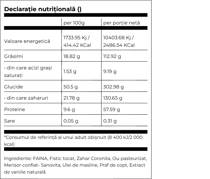 Ingrediente:faina alba de grau, zahar, arahide, nuca, albus pasteurizat, galbenus pasteurizat, lapte 3,5% grasime, ulei de floarea soarelui, unt 82% grasime, cafea solubila, extract natural de vanilie, coaja de portocala, coaja de lamaie, drojdie, sare.