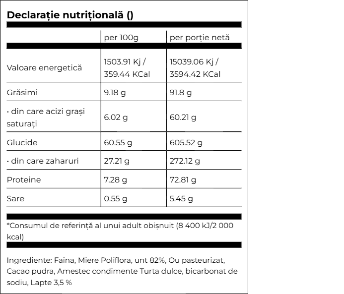 Ingrediente:faina alba de grau, zahar, arahide, nuca, albus pasteurizat, galbenus pasteurizat, lapte 3,5% grasime, ulei de floarea soarelui, unt 82% grasime, cafea solubila, extract natural de vanilie, coaja de portocala, coaja de lamaie, drojdie, sare.