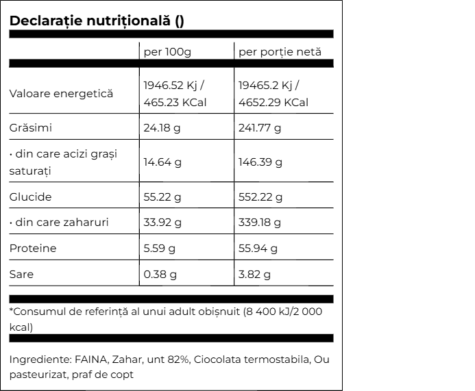 Ingrediente:Faina alba de grau, zahar, ciocolata neagra termostabila, unt 82% grasime, oua pasteurizate, praf de copt.