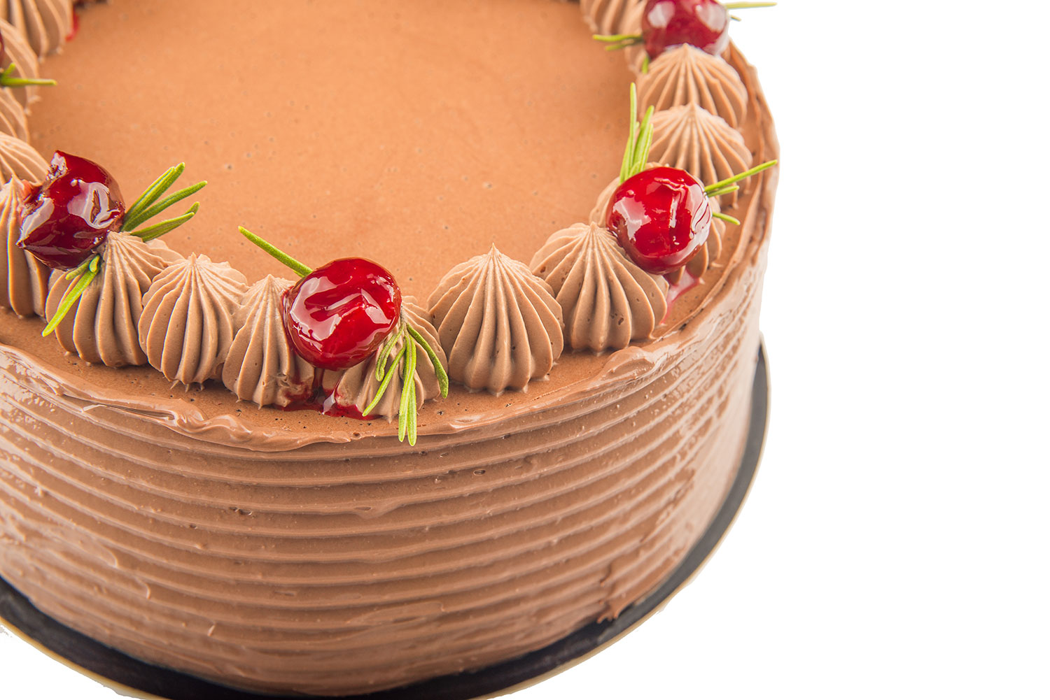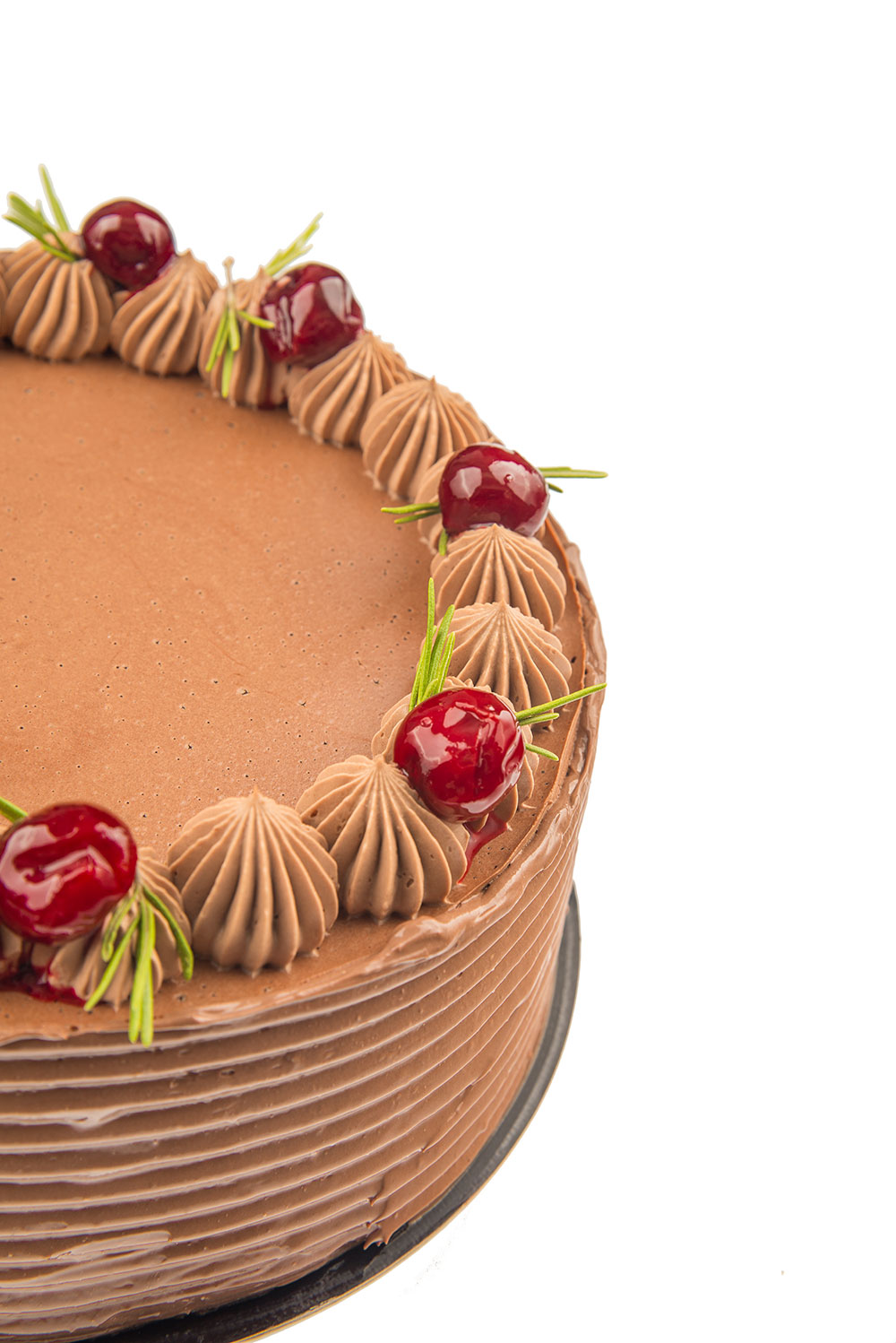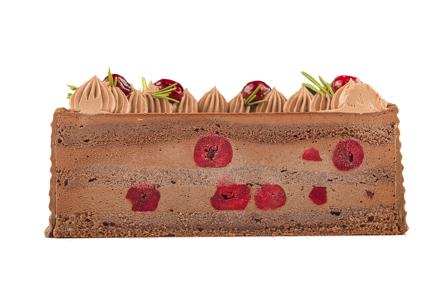 Foi pandispan albe si foaie de pandispan cu cacao cu sirop de lamaie si menta, mousse decapsune, mousse de ciocolata alba, topping din ganache de ciocolata alba si decor din zmeura liofilizata.