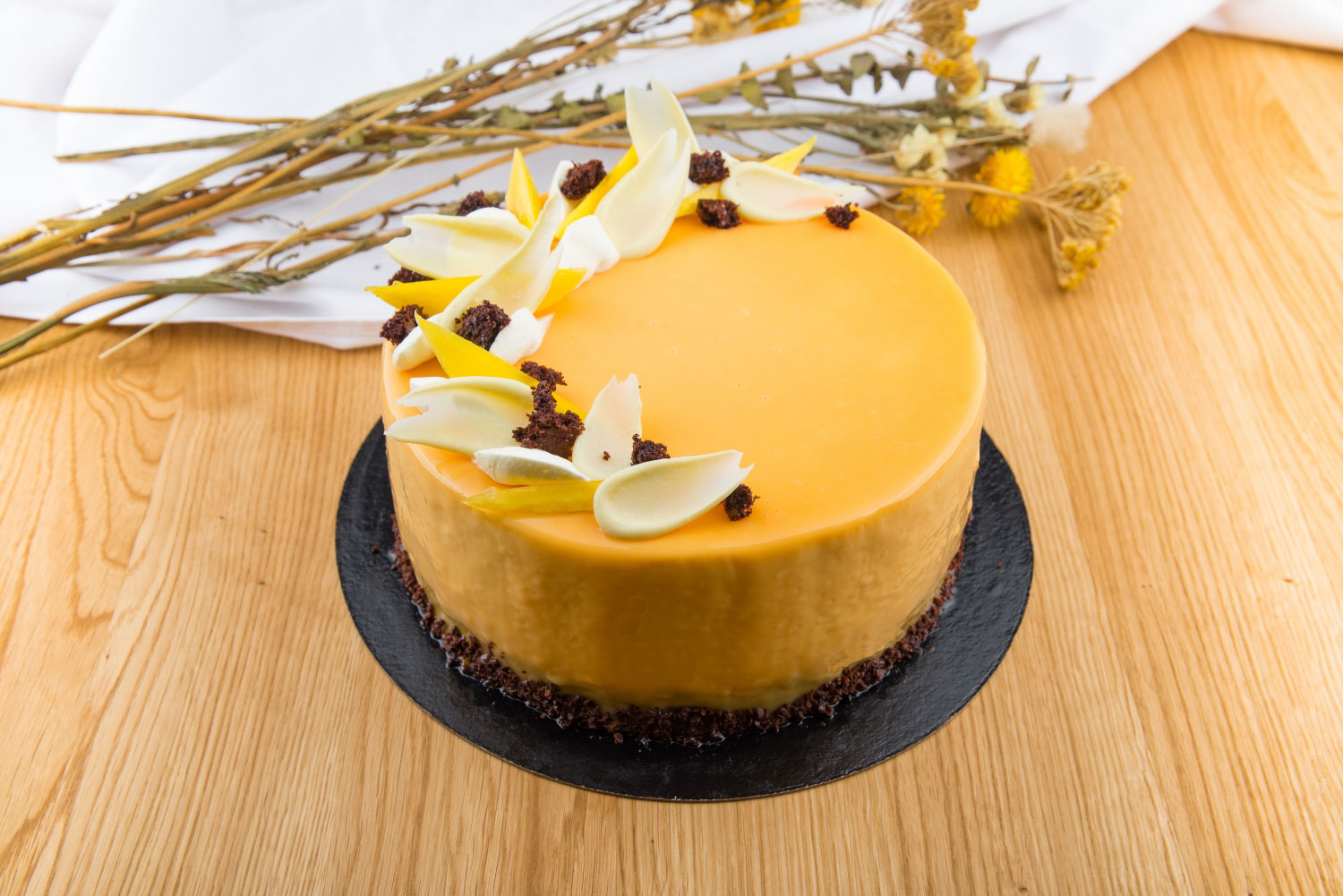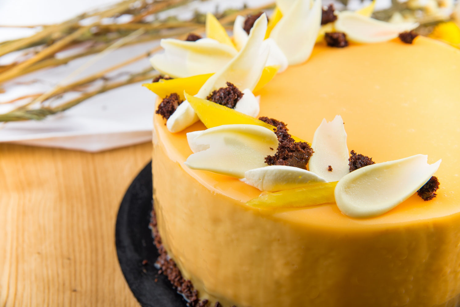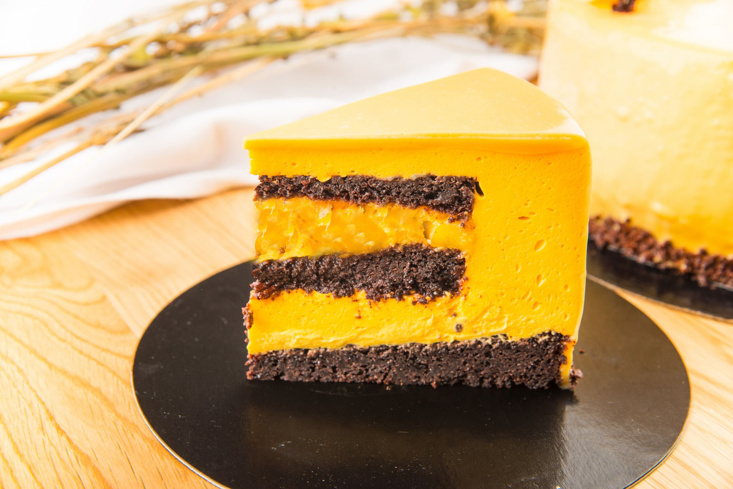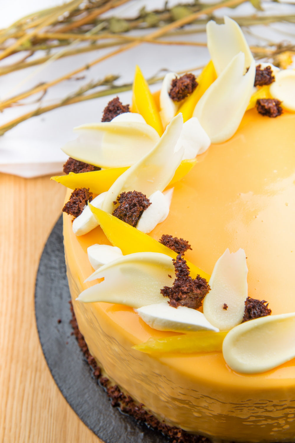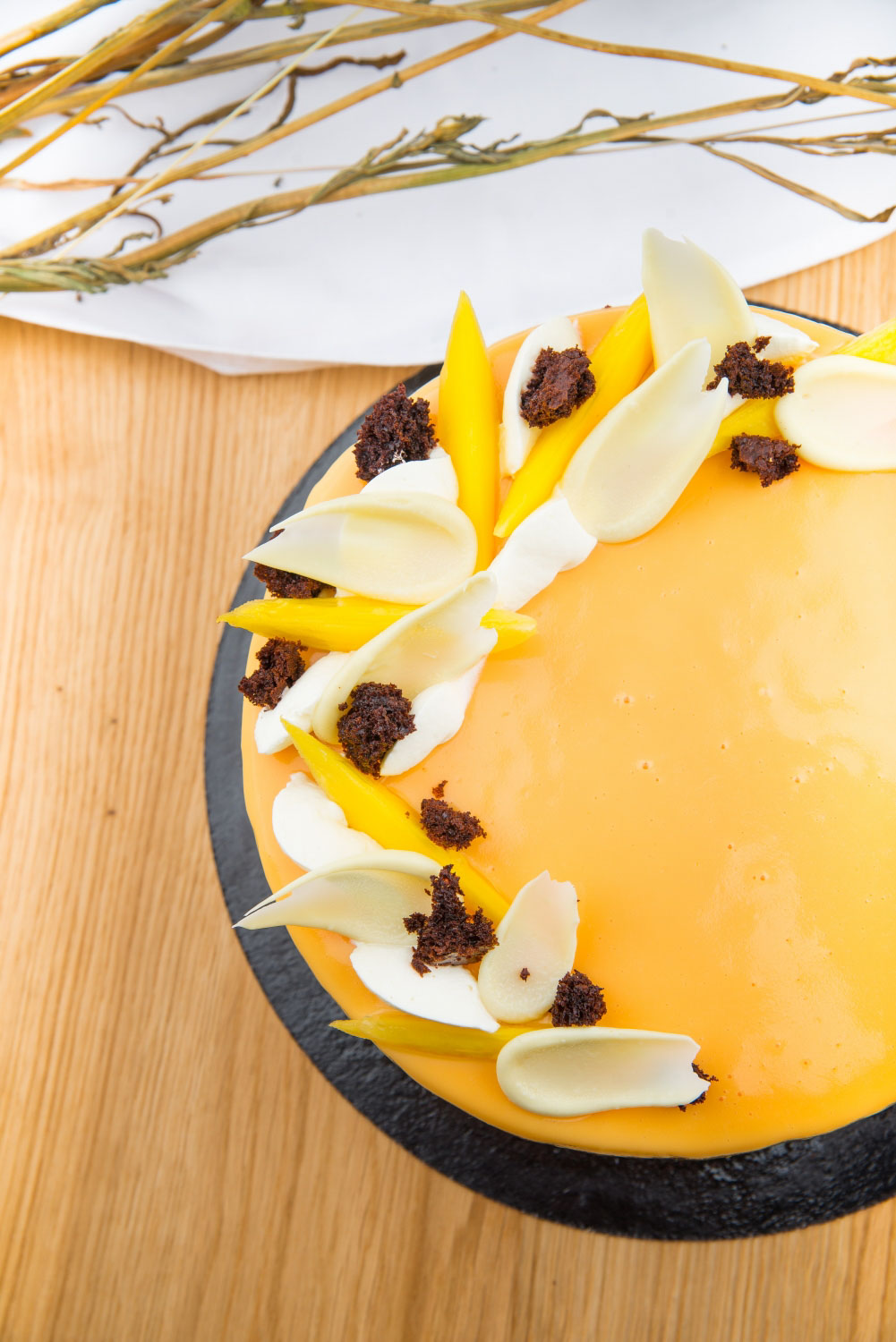 Blaturi pandispan de cacao cu sirop de zahar ars si portocala, crema din ciocolata neagra si ciocolata cu lapte, visine la interior, imbracat in crema de ciocolata neagra cu ciocolata cu lapte, decor din glazura lucioasa, ciocolata neagra, aveline din mousse de ciocolata si decor din visine cu frunzulite de rozmarin